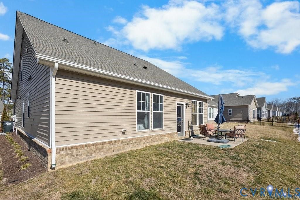 Welcome to 1713 Mainsail Ln in Twin Rivers, a James River front community offering an exceptional lifestyle with HOA amenities including a private association boat ramp with James River access, clubhouse, exercise room, jogging paths, a pool with kiddie pool/water park, & community ponds for fishing. This well-designed 3-bedroom, 3-bath home offers 1,695 sq ft of living space with 9-foot ceilings throughout. The open-concept first floor features LVP flooring in the dining, kitchen, & living areas with recessed lighting & abundant natural light. The kitchen shines with a large eat-at island with quartz countertops, deep stainless sink, ample cabinetry, two-door pantry, & stainless steel appliances, including a gas range with built-in griddle (5-burner functionality), vent hood, & subway tile backsplash. The living room opens to a glass door leading to a powered, well-lit rear patio, ideal for relaxing or entertaining. The first-floor primary suite features carpet, a spacious walk-in closet, & an ensuite bath with tile floors, double vanity, & a walk-in shower with glass door & bench. A second first-floor bedroom (currently used as an office), full hall bath, laundry closet with hookups, & linen closet complete the main level. Upstairs includes a bright sitting/reading area, utility closet with HVAC, full hall bath, & a sun-filled third bedroom with dual windows. Additional features include wired smoke alarms, IQ security panel, keyless entry, Ring doorbell, tankless gas water heater, & TV mount connections. Exterior highlights include a covered front porch with brick & wood columns, stone & brick facade, vinyl siding, insulated doors, thermal windows, gutters, a double-width paved driveway, finished 2-car garage, powered rear patio, & irrigation system, making this home a standout in one of Chester's most desirable riverfront communities.